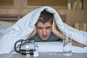 lifestyle home portrait of young exhausted and wasted man waking up suffering headache and hangover after drinking alcohol at night party lying on bed sick and miserable still drunk